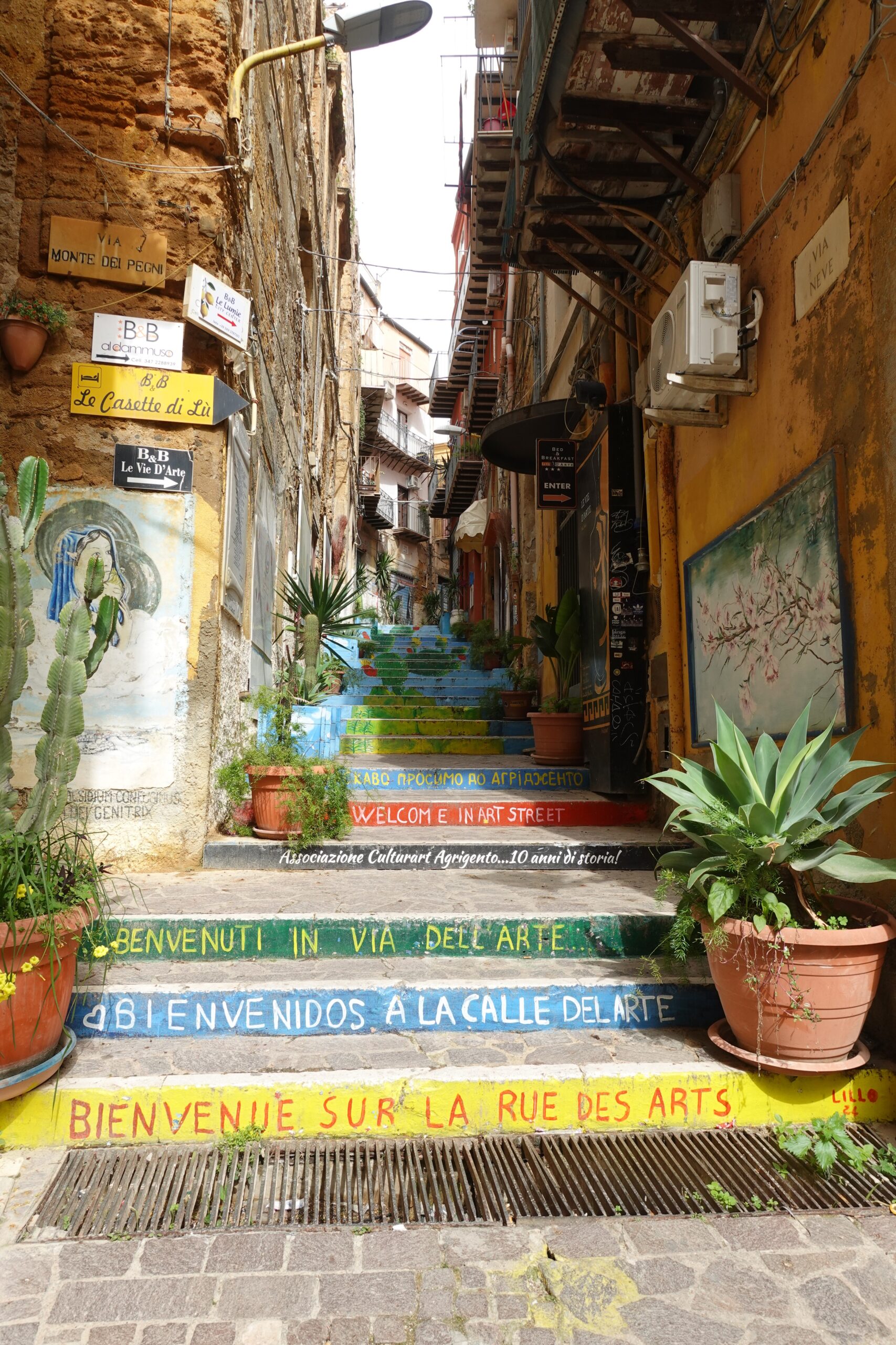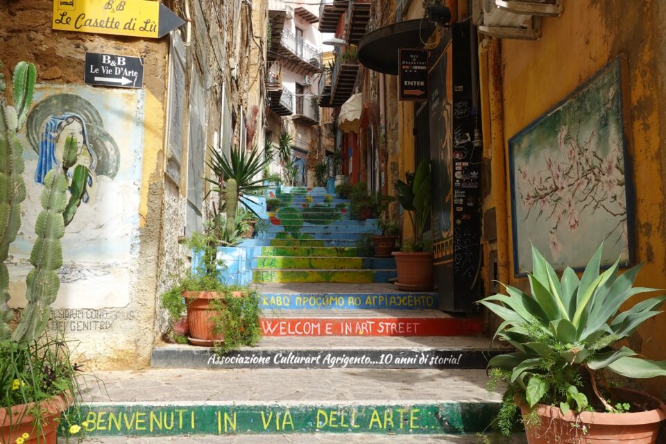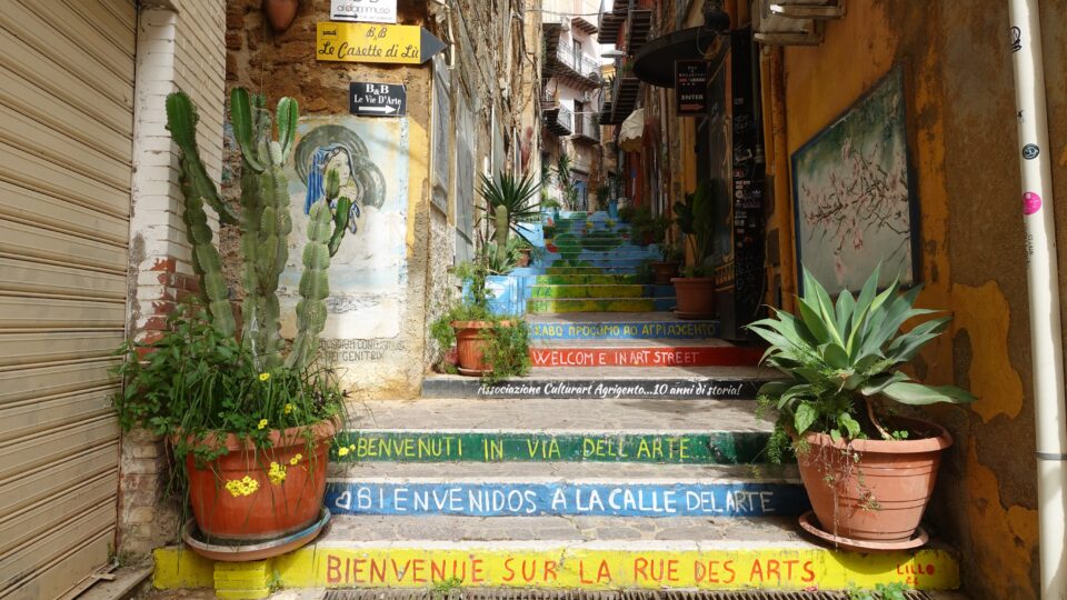 We walked down to see one of the small artistic touches the city has added in recent years: a staircase where each step is painted with words and phrases. These kinds of decorated stairways have become popular in several Sicilian towns, turning ordinary steps into small public art pieces.
